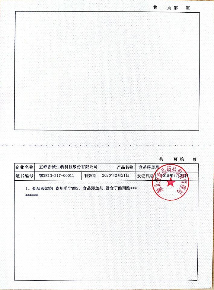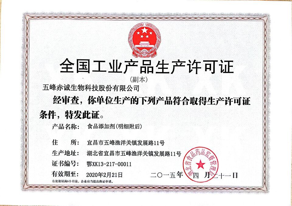 4月21日, 五峰赤誠(chéng)生物科技股份有限公司食品添加劑食用單寧酸、沒(méi)食子酸丙酯獲得湖北省食品藥品監(jiān)督管理局頒發(fā)的全國(guó)工業(yè)產(chǎn)品生產(chǎn)許可證。證書(shū)編號(hào):鄂XK13-217-00011,有效期至2020年2月21日。