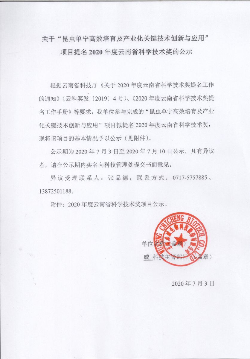 關(guān)于“昆蟲單寧高效培育及產(chǎn)業(yè)化關(guān)鍵技術(shù)創(chuàng)新與應用”項目提名2020年度云南省科學技術(shù)獎公示